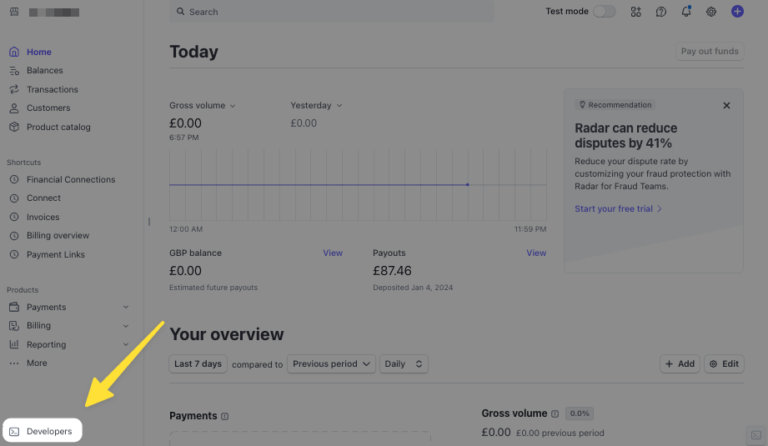Make sure the toggle switch for test/live mode that you’ll see at the top of your screen is not selected. We don’t want Test mode activated.